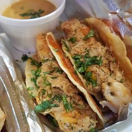 Two Delicious Crab & Shrimp Crispy Tacos with Beans & Rice and Butter Cream dipping sauce